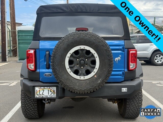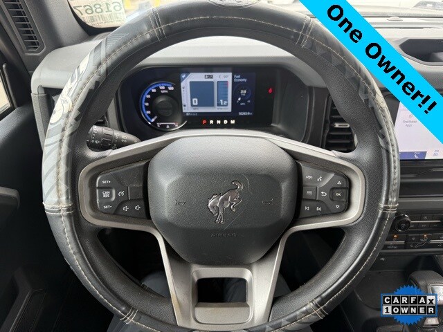 This Ford Bronco has many features and is well equipped including Equipment Group 101A Standard Package, Sasquatch Package (4.7 Final Drive Ratio and High Clearance Suspension), 4-Wheel Disc Brakes, 6 Speakers, ABS brakes, Air Conditioning, AM/FM radio: SiriusXM with 360L, AM/FM Stereo, Auto High-beam Headlights, Brake assist, Cloth Bucket Seats, Compass, Delay-off headlights, Driver door bin, Driver vanity mirror, Dual front impact airbags, Dual front side impact airbags, Emergency communication system: 911 Assist, Exterior Parking Camera Rear, Front anti-roll bar, Front Bucket Seats, Front Center Armrest, Front reading lights, Front wheel independent suspension, Fully automatic headlights, Heated door mirrors, Illuminated entry, Integrated roll-over protection, Low tire pressure warning, Occupant sensing airbag, Outside temperature display, Overhead airbag, Overhead console, Panic alarm, Passenger door bin, Passenger vanity mirror, Power door mirrors, Power steering, Power windows, Radio data system, Remote keyless entry, Security system, SiriusXM Radio w/360L, Speed control, Split folding rear seat, Steering wheel mounted audio controls, SYNC 4, Tachometer, Telescoping steering wheel, Tilt steering wheel, Traction control, Trip computer, and Variably intermittent wipers. Blue 2021 Ford Bronco 4WD 10-Speed Automatic 2.3L EcoBoost I-4