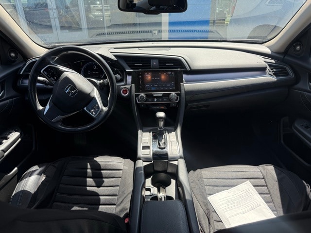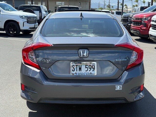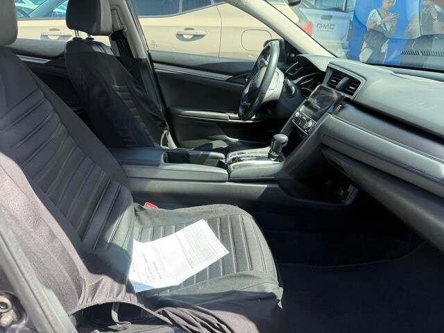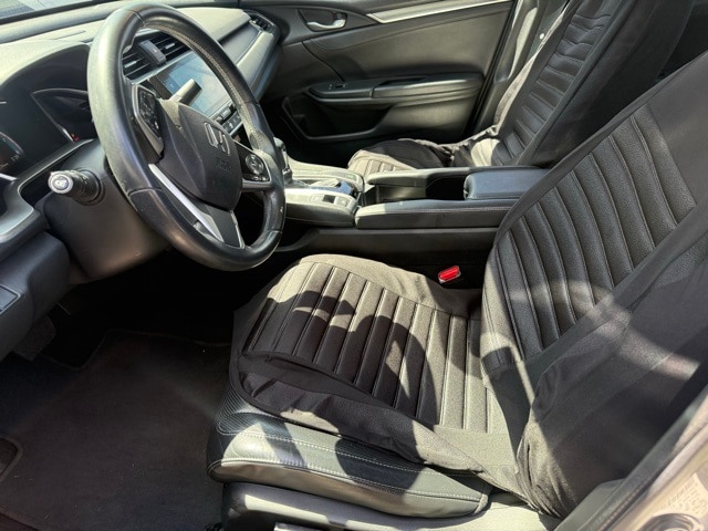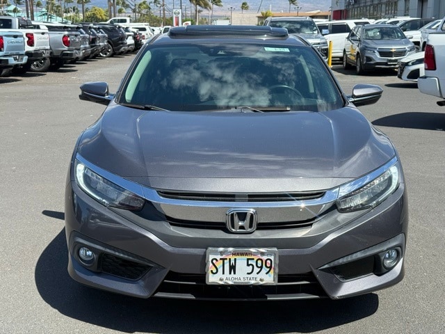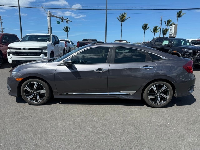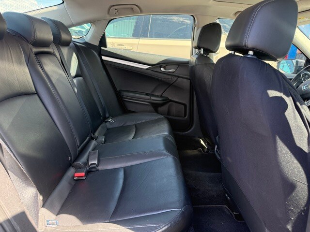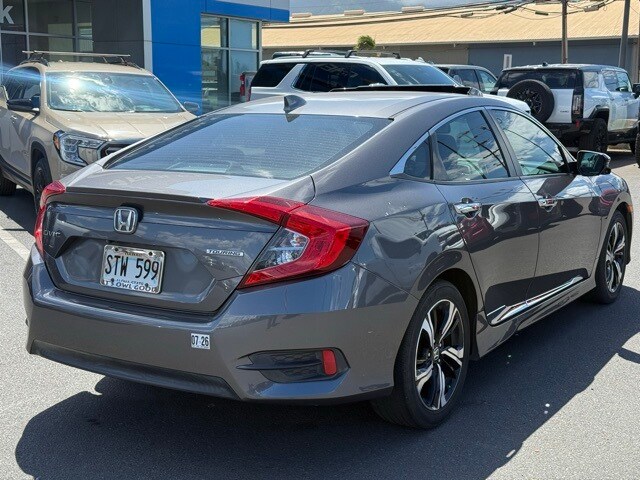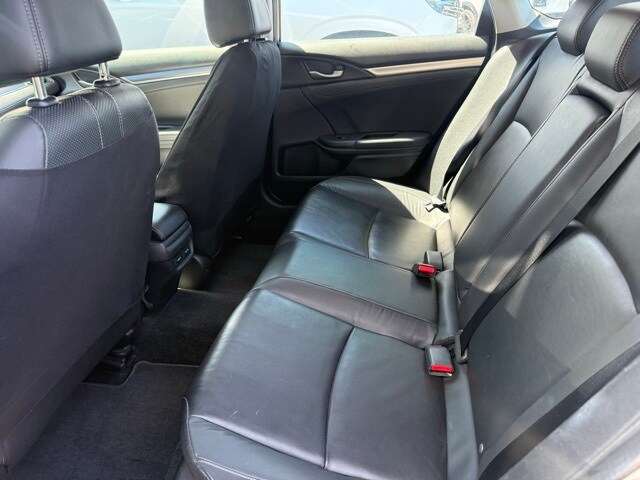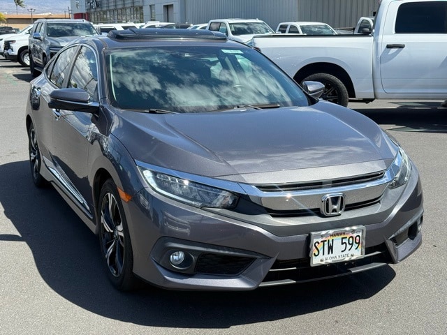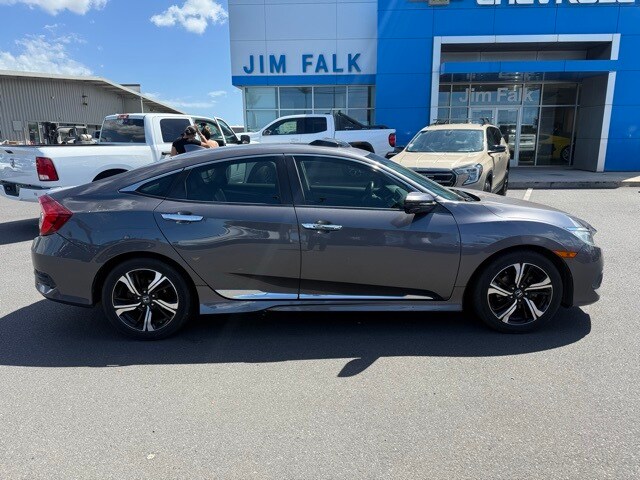 This Honda Civic has many features and is well equipped including Black w/Cloth Seat Trim, 10 Speakers, 17" Alloy Wheels, 4-Wheel Disc Brakes, ABS brakes, Air Conditioning, Alloy wheels, AM/FM radio: SiriusXM, Apple CarPlay/Android Auto, Auto-dimming Rear-View mirror, Automatic temperature control, Brake assist, Bumpers: body-color, Compass, Delay-off headlights, Driver door bin, Driver vanity mirror, Dual front impact airbags, Dual front side impact airbags, Electronic Stability Control, Emergency communication system: HondaLink Assist, Exterior Parking Camera Rear, Four wheel independent suspension, Front anti-roll bar, Front Bucket Seats, Front Center Armrest, Front dual zone A/C, Front fog lights, Front reading lights, Fully automatic headlights, Heated door mirrors, Heated front seats, Heated rear seats, Illuminated entry, Leather Seat Trim, Leather Shift Knob, Low tire pressure warning, Navigation System, Occupant sensing airbag, Outside temperature display, Overhead airbag, Panic alarm, Passenger door bin, Passenger vanity mirror, Power door mirrors, Power driver seat, Power moonroof, Power passenger seat, Power steering, Power windows, Radio data system, Radio: 450-Watt AM/FM/HD/SiriusXM Audio System, Rain sensing wipers, Rear anti-roll bar, Rear seat center armrest, Rear window defroster, Reclining Heated Front Bucket Seats, Remote keyless entry, Security system, Speed control, Speed-sensing steering, Speed-Sensitive Wipers, Split folding rear seat, Spoiler, Steering wheel mounted audio controls, Tachometer, Telescoping steering wheel, Tilt steering wheel, Traction control, Trip computer, Turn signal indicator mirrors, and Variably intermittent wipers. Gray 2016 Honda Civic Touring FWD CVT 1.5L I-4 DI DOHC Turbocharged Black w/Cloth Seat Trim.