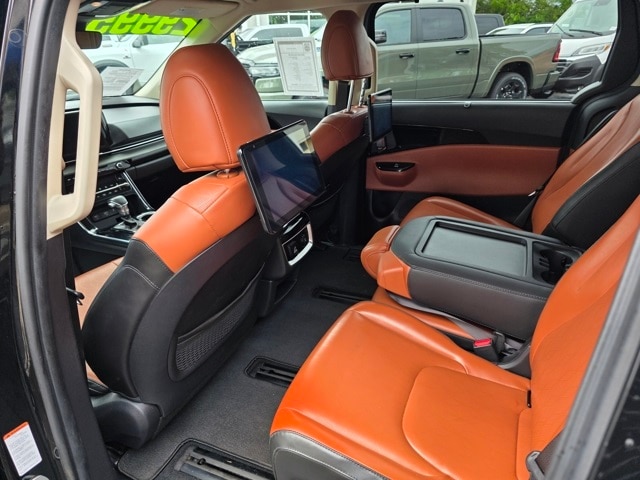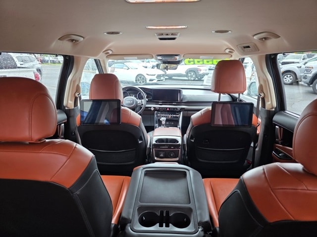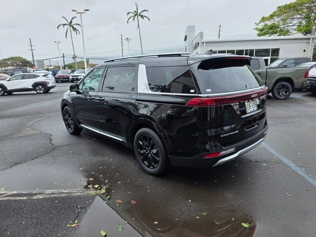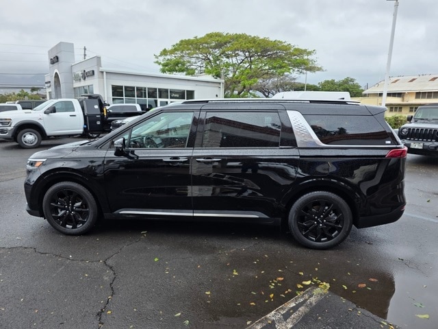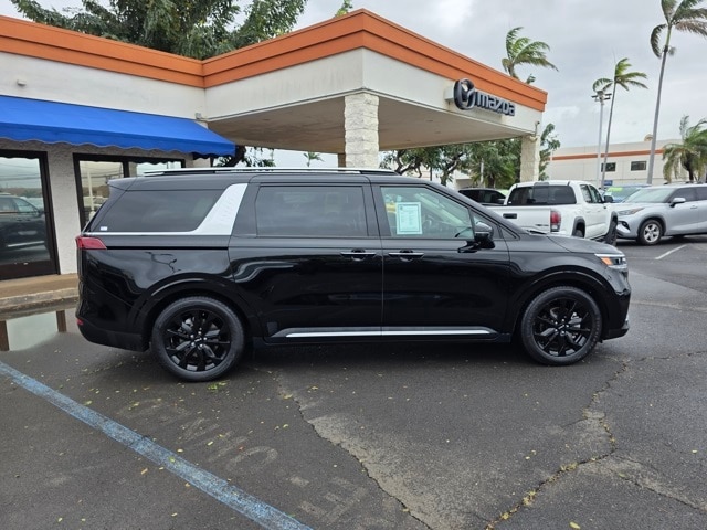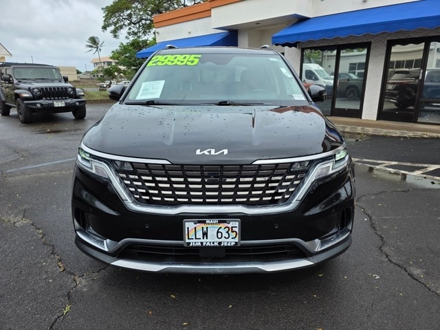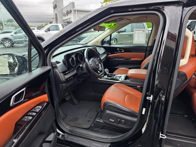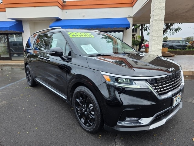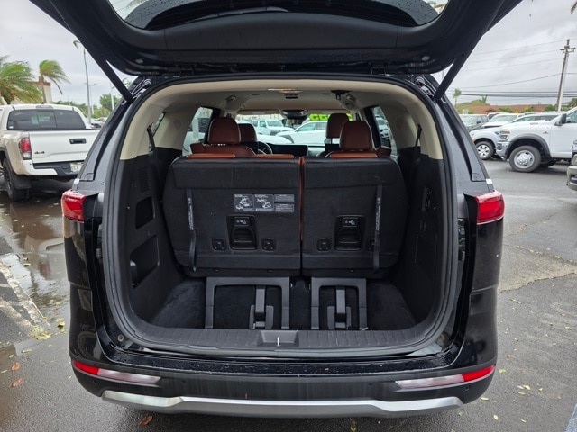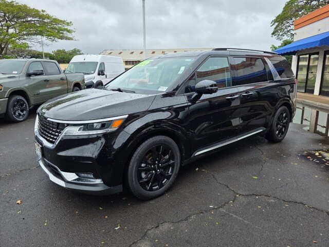 This Kia Carnival has many features and is well equipped including 3.51 Axle Ratio, 3rd row seats: split-bench, 4-way Power Driver's Lumbar Support, 4-Wheel Disc Brakes, 8 Speakers, 8 Way Power Driver's Seat, 8 Way Power Front Passenger's Seat, ABS brakes, Air Conditioning, Alloy wheels, AM/FM radio: SiriusXM, Apple CarPlay & Android Auto, Artificial Leather Seat Trim, Auto High-beam Headlights, Automatic temperature control, Brake assist, Bumpers: body-color, Cargo Net, Carpeted Floor Mats (8-Passenger), Compass, Delay-off headlights, Driver door bin, Driver vanity mirror, Driver's Seat & Mirrors Memory System, Dual front impact airbags, Dual front side impact airbags, Electronic Stability Control, Emergency communication system: UVO eServices, Four wheel independent suspension, Front anti-roll bar, Front Bucket Seats, Front Center Armrest, Front dual zone A/C, Front fog lights, Front reading lights, Fully automatic headlights, Heated & Ventilated Front Bucket Seats, Heated door mirrors, Heated front seats, Illuminated entry, Knee airbag, Leather Shift Knob, Leather steering wheel, Low tire pressure warning, Memory seat, Navigation system: UVO eServices, Occupant sensing airbag, Outside temperature display, Overhead airbag, Overhead console, Panic alarm, Passenger door bin, Passenger vanity mirror, Power door mirrors, Power driver seat, Power Liftgate, Power passenger seat, Power steering, Power windows, Radio: AM/FM/HD Audio System, Rear air conditioning, Rear anti-roll bar, Rear reading lights, Rear window defroster, Rear window wiper, Reclining 3rd row seat, Remote keyless entry, Roof rack: rails only, Security system, Speed control, Speed-sensing steering, Split folding rear seat, Spoiler, Steering wheel mounted audio controls, Tachometer, Telescoping steering wheel, Textured Bumper Applique, Tilt steering wheel, Traction control, Trip computer, Turn signal indicator mirrors, Variably intermittent wipers, Ventilated front seats, and Wheels: 7.5J x 19" Black Painted Alloy. Aurora Black 2022 Kia Carnival SX FWD 8-Speed Automatic V6