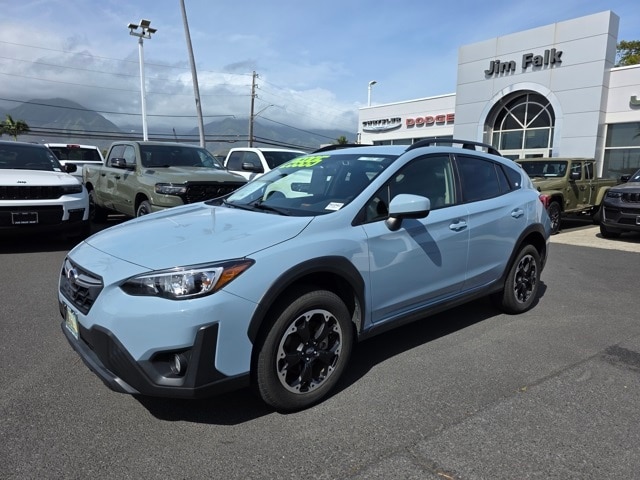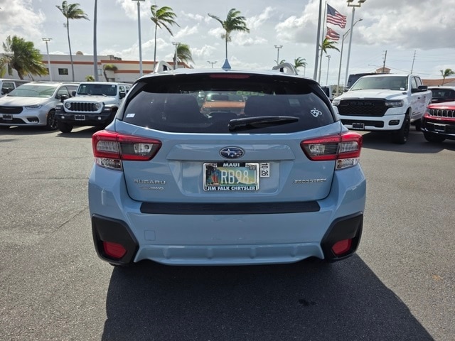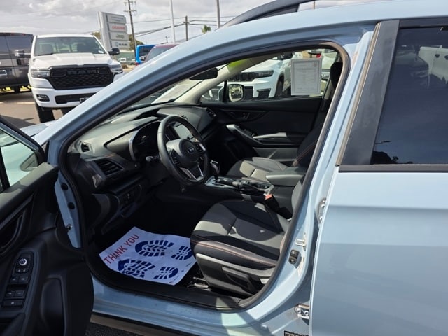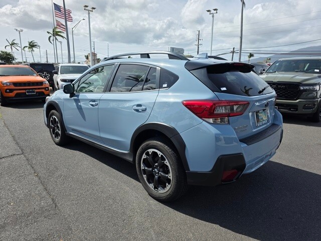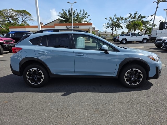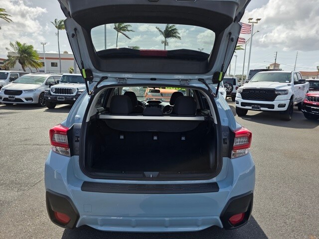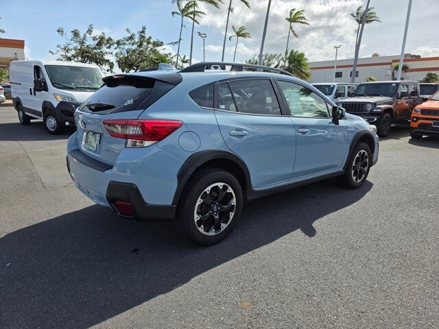 This Subaru Crosstrek has many features and is well equipped including 3.90 Axle Ratio, 4-Wheel Disc Brakes, 6 Speakers, ABS brakes, Air Conditioning, Alloy wheels, AM/FM radio: SiriusXM, Anti-whiplash front head restraints, Automatic temperature control, Brake assist, Bumpers: body-color, CD player, Cloth Upholstery, Driver door bin, Driver vanity mirror, Dual front impact airbags, Dual front side impact airbags, Electronic Stability Control, Emergency communication system: STARLINK Safety and Security (Subscription Required), Exterior Parking Camera Rear, Four wheel independent suspension, Front anti-roll bar, Front Bucket Seats, Front Center Armrest, Front fog lights, Front reading lights, Fully automatic headlights, Heated door mirrors, Heated Front Bucket Seats, Heated front seats, Illuminated entry, Knee airbag, Leather Shift Knob, Low tire pressure warning, Occupant sensing airbag, Outside temperature display, Overhead airbag, Overhead console, Panic alarm, Passenger door bin, Passenger vanity mirror, Power door mirrors, Power steering, Power windows, Radio data system, Radio: Subaru STARLINK 6.5" Multimedia Plus System, Rear anti-roll bar, Rear window defroster, Rear window wiper, Remote keyless entry, Security system, Speed control, Speed-sensing steering, Split folding rear seat, Spoiler, STARLINK/Apple CarPlay/Android Auto, Steering wheel mounted audio controls, Tachometer, Telescoping steering wheel, Tilt steering wheel, Traction control, Trip computer, Variably intermittent wipers, and Wheels: 17" x 7.0J Alum Alloy Blk w/Machine Finish. Lagoon Blue Pearl 2023 Subaru Crosstrek Premium AWD Lineartronic CVT 2.0L 4-Cylinder DOHC 16V