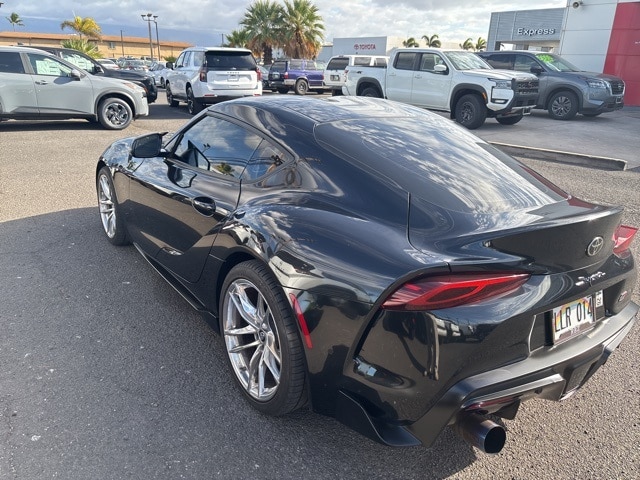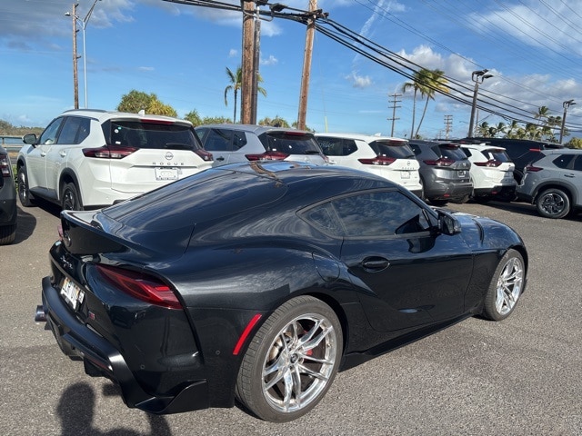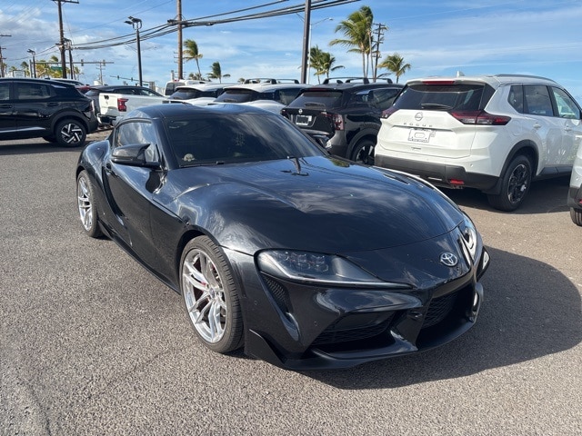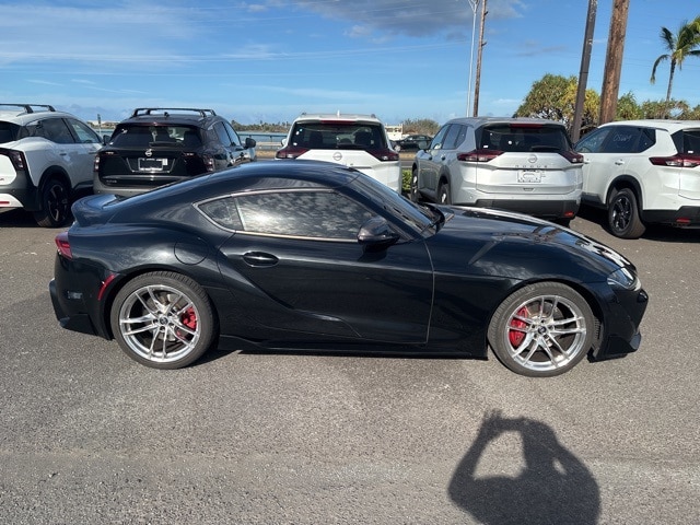 This Toyota Supra has many features and is well equipped including 4-Wheel Disc Brakes, ABS brakes, Adaptive suspension, Air Conditioning, Alloy wheels, AM/FM radio: SiriusXM, Auto High-beam Headlights, Auto-dimming door mirrors, Auto-dimming Rear-View mirror, Automatic temperature control, Brake assist, Bumpers: body-color, Child-Seat-Sensing Airbag, Delay-off headlights, Driver door bin, Driver vanity mirror, Dual front impact airbags, Dual front side impact airbags, Electronic Stability Control, Exterior Parking Camera Rear, Four wheel independent suspension, Front anti-roll bar, Front Bucket Seats, Front Center Armrest, Front dual zone A/C, Front fog lights, Front reading lights, Fully automatic headlights, Garage door transmitter: HomeLink, Heated door mirrors, Illuminated entry, Knee airbag, Leather Shift Knob, Leather steering wheel, Low tire pressure warning, Memory seat, Occupant sensing airbag, Outside temperature display, Overhead airbag, Panic alarm, Passenger door bin, Passenger vanity mirror, Power door mirrors, Power driver seat, Power passenger seat, Power steering, Power windows, Radio data system, Rain sensing wipers, Rear anti-roll bar, Rear window defroster, Remote keyless entry, Security system, Speed control, Speed-sensing steering, Speed-Sensitive Wipers, Steering wheel mounted audio controls, Tachometer, Telescoping steering wheel, Tilt steering wheel, Traction control, Trip computer, Turn signal indicator mirrors, Variably intermittent wipers, and Wheels: 19" Forged Aluminum w/Painted Accents. Black 2021 Toyota Supra 3.0 RWD 8-Speed Automatic 3.0L I6 Turbocharged